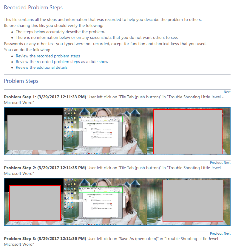 Windows PSR “Problem Steps Recorder”. It’s a nifty tool that helps you trouble shoot a computer problem by recording step by step what the user is doing.