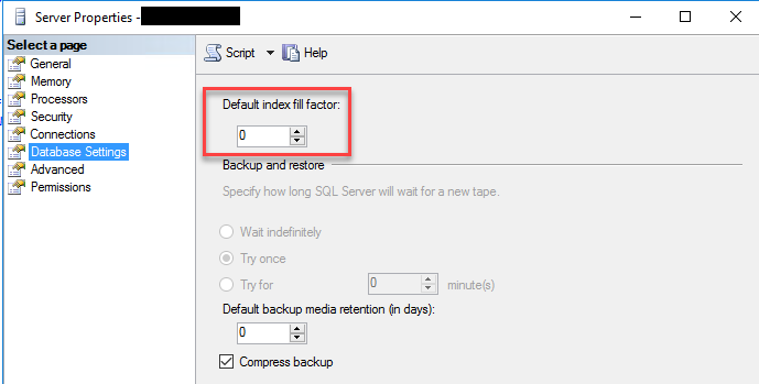 If you find that this is how your system is configured, all is not lost. You can correct this by changing the default value so that new indexes will be created with proper factor and rebuilding your existing indexes with another fill factor value. I like to use 80 across the board for most, of course there is always the “it depends” scenario that arises but 80 is a pretty safe bet. One of those “it depends” would be on logging table that has the correct clustering key and never gets updates in between values (make sense?), I don’t want a fill factor of 80. I’d want 0/100 to maximize page density as page splits wouldn’t occur if the clustered key is monotonically increasing.